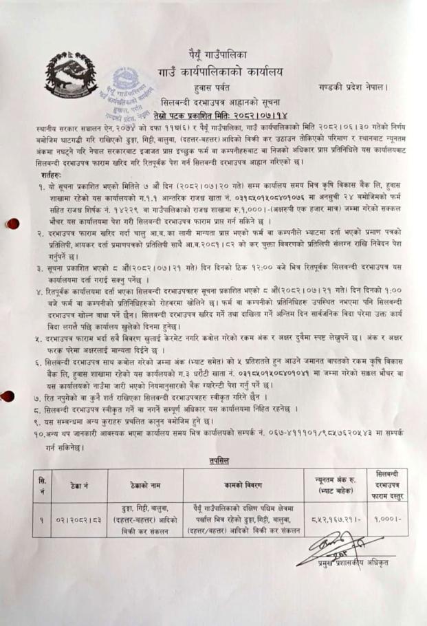 सिलबन्दी दरभाउपत्र आह्वानको सूचना ।