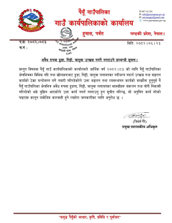 अवैध रुपमा ढुङ्गा ,गिट्टी,बालुवा उत्खनन नगर्ने नगराउने सम्बन्धी सूचना।