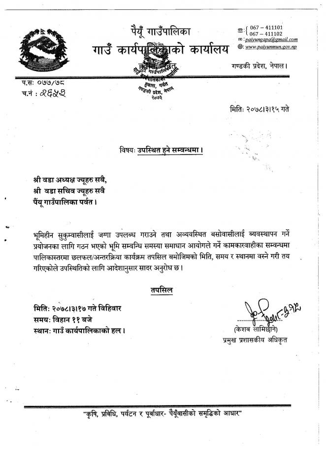उपस्थित हुने सम्बन्धमा। (वडा अध्यक्ष/वडा सचिव ज्यूहरु)