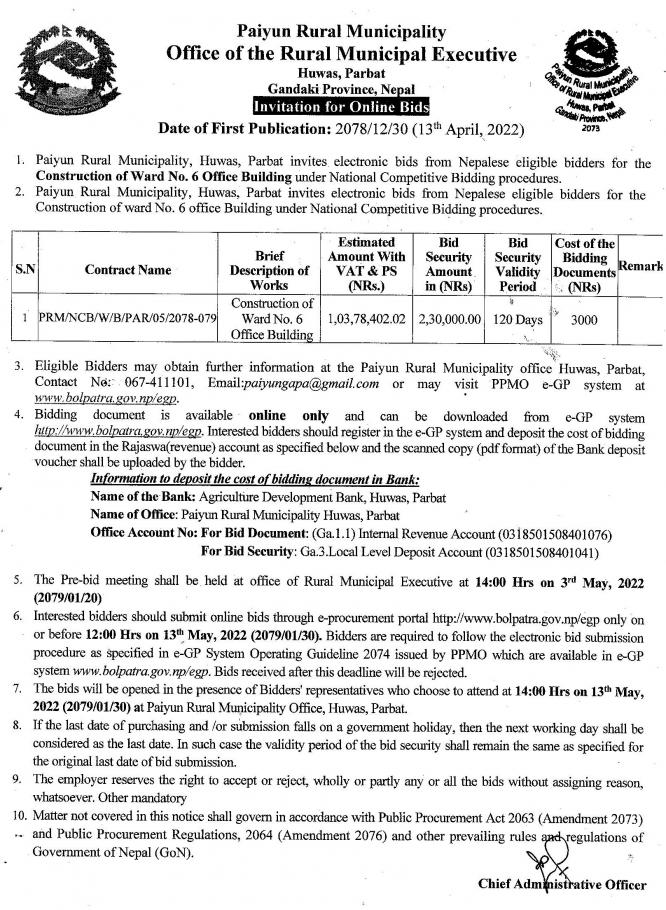 » बोलपत्र आव्हानको सूचना !(Construction of Ward No. 6 Office Building)
