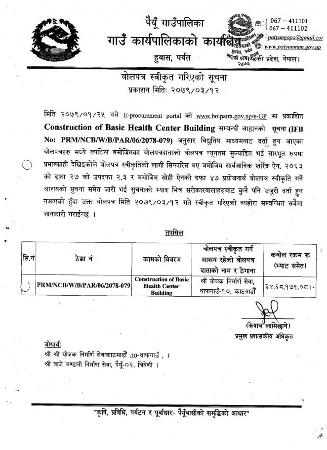 बोलपत्र स्वीकृत गरीएको सूचना !(Construction of Basic Health Center Building)