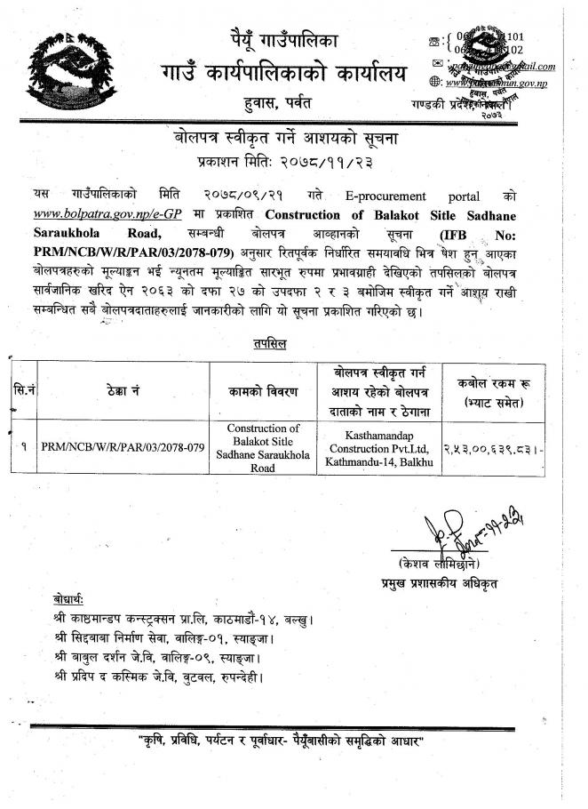 बोलपत्र स्वीकृत गर्ने आशयको सूचना !(Construction of Balakot Sitle Sadhane Saraukhola Road)