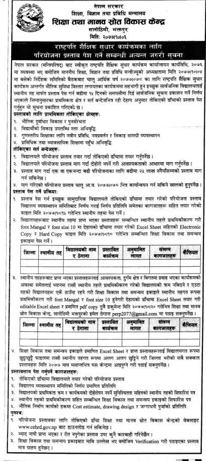 राष्ट्रिय शैक्षिक सुधार कार्यक्रमका लागि परियोजना प्रस्ताव पेश गर्ने सम्बन्धि अत्यन्त जरुरी सूचना