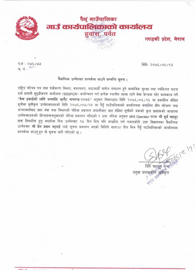 वैकल्पिक उम्मेदवार सम्पर्कमा आउने सम्बन्धि सूचना ! (MIS Operator)