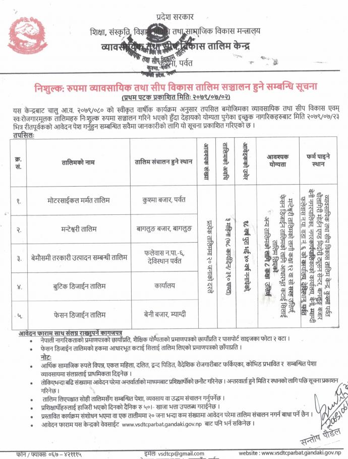 व्यावसायिक तथा सीप विकास तालीम केन्द्र, पर्वतको निशुल्कः रुपमा व्यावसायिक तथा सीप विकास तालिम सञ्चालन हुने सम्बन्धी सूचना!