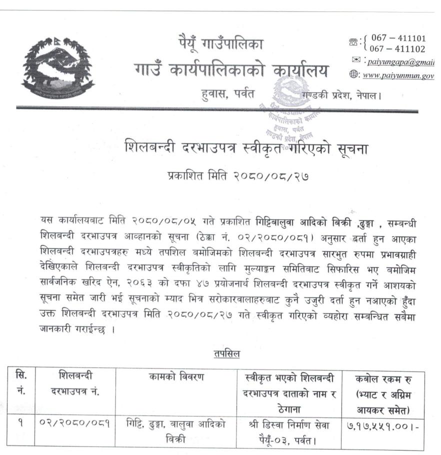 शिलबन्दी दरभाउपत्र स्वीकृत गरिएको सूचना ।