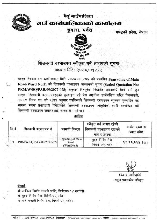 » शिलबन्दी दरभाउपत्र स्वीकृत गर्ने आशयको सूचना ![Upgrading of Main Road(Ward No.5)]