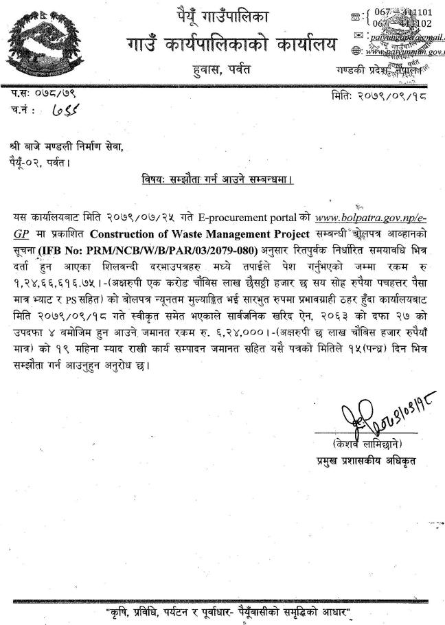 बोलपत्र स्वीकृत गर्ने आशयको सूचना।