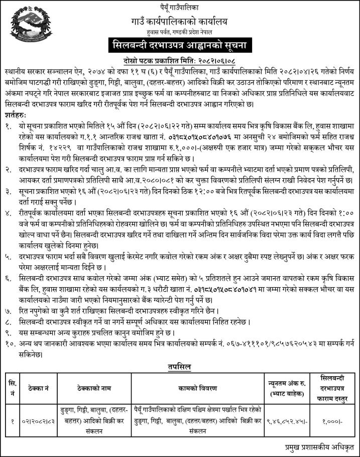 सिलबन्दी दरभाउपत्र आह्वानको सूचना ।