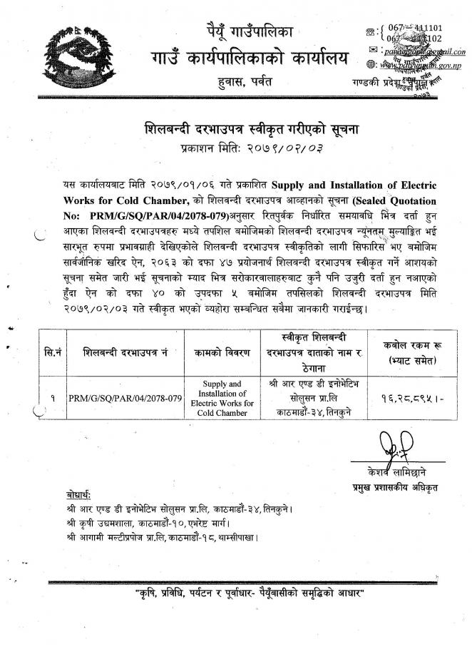 सिलबन्दी दरभाउपत्र स्वीकृत गरिएको सूचना![Supply and Installation of Electric Works for Cold Chamber]
