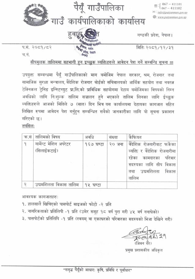 सीपमुलक तालिममा सहभागी हुन इच्छुक व्यक्तिहरुले आवेदन पेश गर्ने सम्बन्धि सूचना।